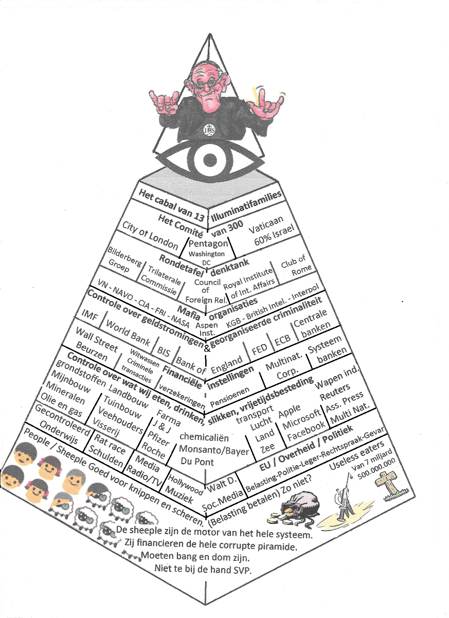 Boven in de piramide zit het alziend oog. Daarin zitten de Zwarte Paus en verder de 13 bankiersfamilies en de 13 Vrijmetselaar/Jezuïeten families. Daaronder zit het Committee van 300, opgericht door koningin Elizabeth I in 1600, met daarin de East India Company, de City of London en het Britse vorstenhuis. Daaronder de Bilderberg groep met daarin onder meer de grote banken, de Federal Reserve bank (FED), de Bank of International Settlement (BIC), de Europese Centrale Bank (ECB) en vooraanstaande families als Bush, Clinton en de Oranjes. Dan komt de Skull & Bones groep met het Vaticaan de Trilateral Commission, de Council of Foreign Relations, het World Economic Forum en de 1001 club. Daar weer onder zitten een aantal belangrijke organisaties zoals de Wereldbank, de World Trade Organisation (WTO), de NAVO, het IMF en politieke organisaties als de Khazaarse Maffia, NSA, CIA en FBI. Daaronder bevinden zich dan de grote multinationals zoals de Big Pharma’s, olie-industrieën, energie bedrijven, Wallstreet beurzen, grote verzekeraars en systeembanken. Dan komen de organisaties die de controle hebben over wat wij eten en drinken; de landbouw, tuinbouw, visserij en verder Apple, Microsoft en Google. Tot slot volgen dan de pers en media, CNN, Reuter, Hollywood, de sociale media en diverse EU overheidsinstanties. Helemaal onderaan zitten de ‘Sheeple’, een samentrekking van sheep en people, wij dus.