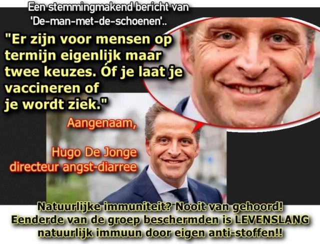Hugo, tot hier en niet verder. Jeroen Pols en Wybren van Haga. Het wetenschappelijke bewijs dat natuurlijke immuniteit langduriger bescherming biedt tegen corona dan vaccinatie, is inmiddels zo overvloedig aan het worden, dat het eigenlijk niet meer te verkopen is dat de minder duurzame synthetische variant in de vorm van het vaccin, nog steeds superieur geacht wordt. Opm. En het is geeneens een vaccin, het is een injectie vol gifstoffen zoals magnetische metaaldeeltjes en grafeenoxide.