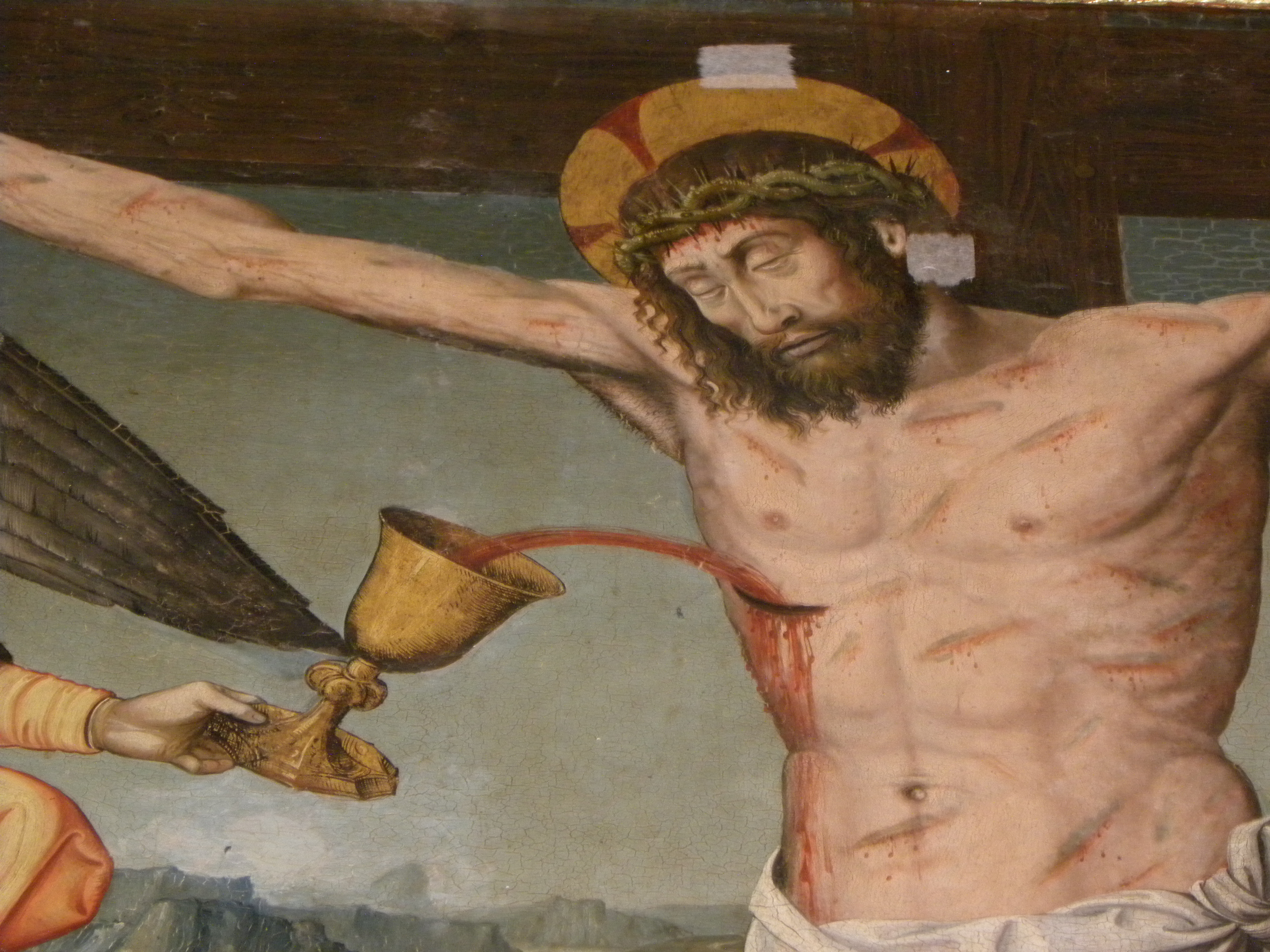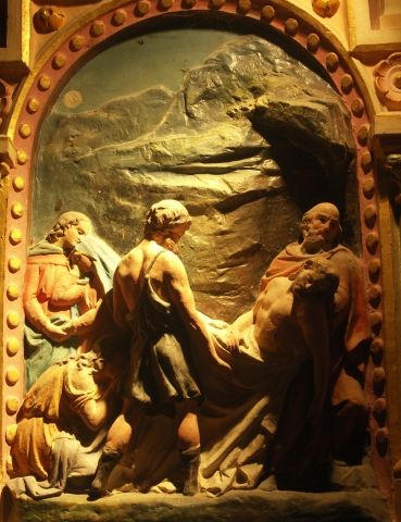 De kruisiging. Die zou op 30 maart in het jaar 33 AD plaats gevonden hebben. Maar ook hier doen verschillende verhalen de ronde. Zo zou Judas geen verrader zijn, maar had hij opdracht van Jezus om zijn verblijfplaats aan de Romeinen te vertellen. Het meest opmerkelijke verhaal is wel dat Jezus niet aan het kruis gestorven zou zijn. En dat ofwel een ander zijn plaats ingenomen heeft, of dat hij, op dringend verzoek van zijn broer Jozef van Aramithea aan Pontius Pilatus, vlak vóór de Sabbath, van het kruis gehaald is, toen men dacht dat hij al dood was. Er zijn talloze afbeeldingen van Jezus die uit zijn wonden bloedt, nadat de speer van Longinus in zijn borst gestoken is, of waar te zien is dat het bloed uit de wonden op zijn handen en voeten stroomt. En dode mensen bloeden niet. Er gaat zelfs het verhaal dat Pontius Pilatus en zijn vrouw Claudia Procula, die een volgeling van Jezus was en een huis bezat in de Languedoc, in het complot zaten. Er zijn meerdere aanwijzingen voor het feit dat Jezus niet aan het kruis gestorven zou zijn, allemaal verhuld weergegeven, opdat men niet door de kerk, wegens ketterij op de brandstapel zou eindigen. Zoals de 14de kruisweg statie in R-L-C, waar Jezus door Jozef van Arimathea en Nicodemus wordt afgelegd. Maar het is nacht. En het was volgens de Joodse wet streng verboden om na zonsondergang met lijken om te gaan. Dus … Kijk ook eens naar het paneel onder het altaar in hetzelfde ketkje. Waar MM geknield zit met gevouwen handen, haar boek, haar bokaal en het kruis. Maar het kruis is van hout en aan het hou zitten blaadjes, dus …