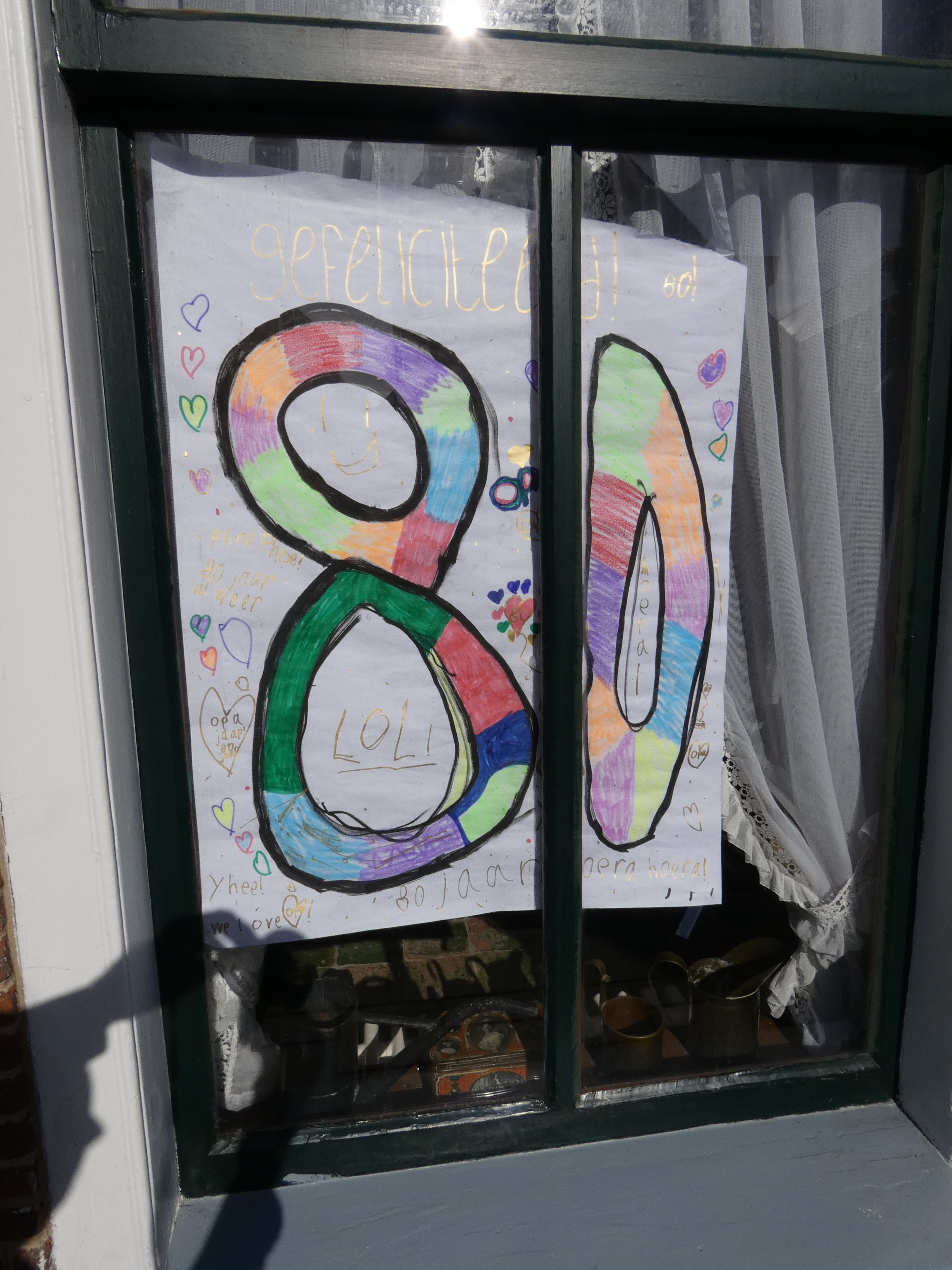 ’s Morgens vroeg heb ik de vlag uitgestoken en heb ik achter het raam van mijn grutterswinkeltje de prachtige tekening opgehangen die de kleinkinderen van Ewout voor me gemaakt hadden. Daar reageerde maar een persoon uit het dorp op, maar dat doet er niet toe, ze hebben het allemaal gezien. Dan de post doornemen en de vele e-mails bekeken. Die kwamen zelfs uit Amerika!