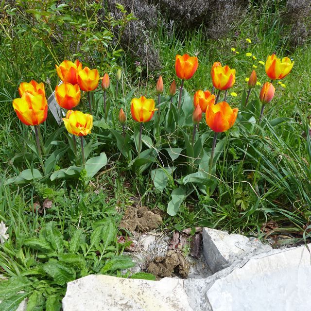 Finally, spring came to us in the south of France. We had two weeks of wonderful weather. And it is great; it is fantastic to see how nature welcomed the sun. And responded to the light. Look at the collection of flower pictures, all taken within two weeks. The cherry blossom {PIC 07}, the forsythia with the standing stone and Buddha across the river {PIC 08}, the tulips {PIC 09 – 11}, the field of yellow flowers south of Rennes-le-Chateau {PIC 12}, the orchids {PIC 13} and the purple tree that can be seen all the way from Rennes-le-Chateau {PIC 14}. And you know what? The air is so clear that everything shines more brightly. Look at this picture of Les Labadous, dressed in soft green ivy {PIC 15}. Look at the Ruisseau des Couleurs, so clear and so happy {PIC 16}. And the sky full of strange, white clouds {PIC 17}. It is magic.