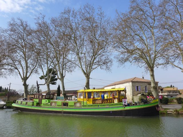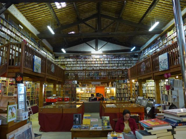 I have been touring the area by myself, like I did in the old days and I have been touring it with good friends in the new days. Every time I discover new things. Like the lovely village of Le Somail, between Narbonne and Minerve, bordering the Canal du Midi. With this boat, annex shop {PIC 18} selling bread and all kinds of touristic things and this huge second hand bookstore {PIC 19}. Or the Chapelle de Centeilles, an ancient chapel on a fortified hilltop with its own well, near the village of Aigne. See {PIC 20} and {PIC 21}.