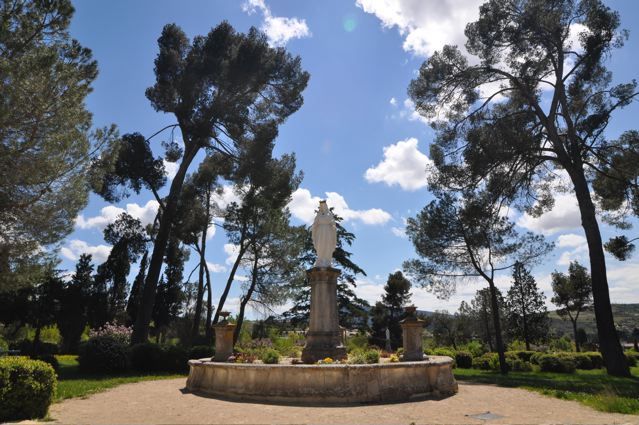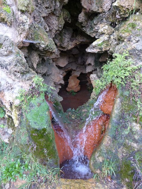 We also took a wonderful trip to the north. First to the ND de Marceille surrounded by beautiful trees {PIC 27} and to the sacred spring on the Voie Sacree, containing water that heals the eyes {PIC 28}. Then to Carcassonne {PIC 29}. From there further north to Caunes Minervois and the ND du Cros with its Black Madonna {PIC 30}, sacred spring {PIC 31} and its lovely picknick place {PIC 32}. Then east, past the enigmatic Dolmen de Fades at Siran {PIC 33} to Minerve. What a beautiful place Minerve is. The weather was fine, it was quiet and the colors were magnificent. So early in the season it is still possible to visit these places without being swamped by tourists. See the famous dove, commemorating the 114 Cathars that were burned alive here in 1210 {PIC 34} and the huge bridge connecting the village to the ‘main land’ {PIC 35}.