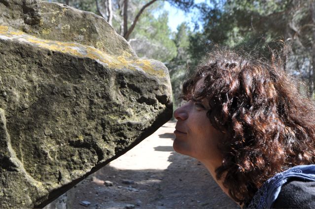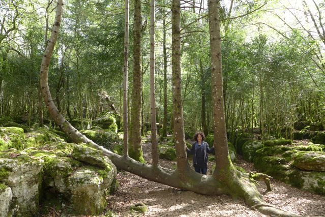 The next day we walked the labyrinth, or it is better to say the maze of Nebias. But not the short version, where you only visit the ‘Labyrinth Verte’, taking about 90 minutes, but he longer version. Which takes about 4 hours. It was an incredible voyage. The labyrinth was still wet from previous rainfall, everything was green, all shades of green and we discovered some wonderful, new, sacred places. But first we had lunch at the lovely little restaurant in Nebias, with its Indian kitchen and biological food {PIC 36}. See how green it is {PIC 37}. Look at those wonderful shapes {PIC 38}. This tree is called “The Harp” {PIC 39}. And this is the largest collection of stones {PIC 40}.