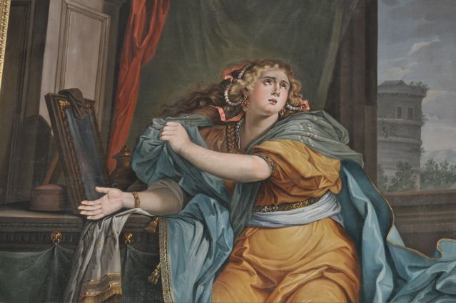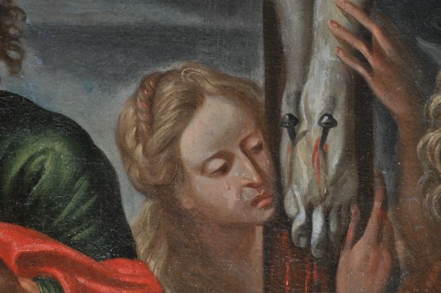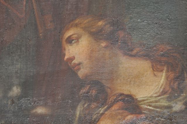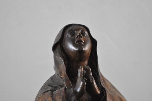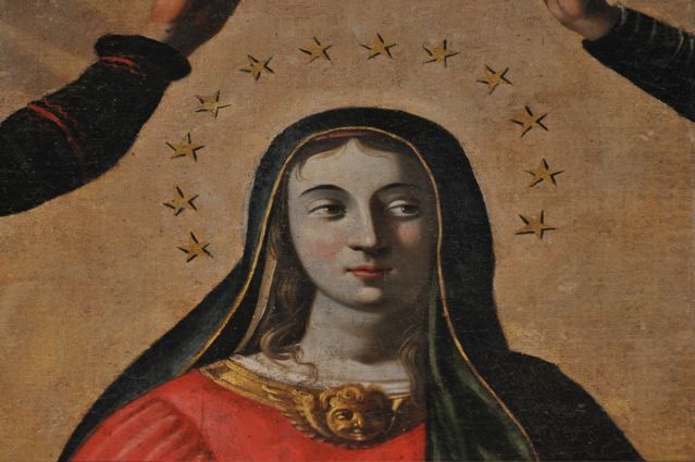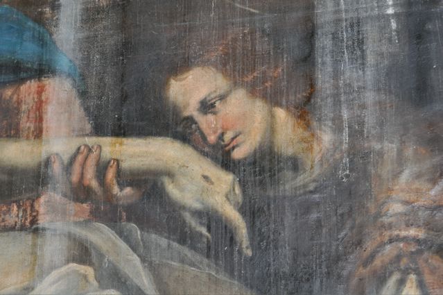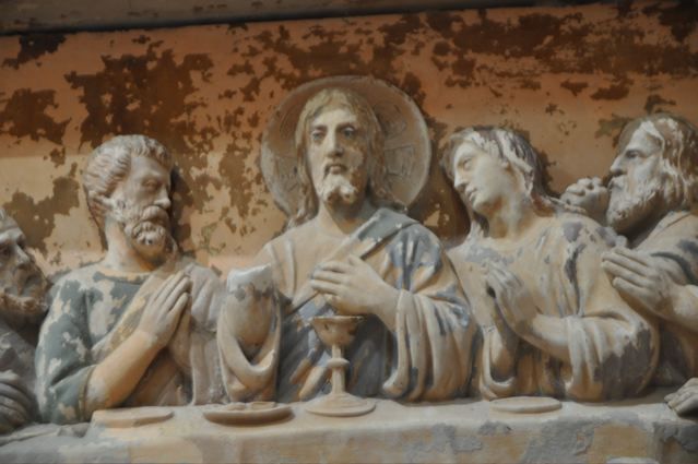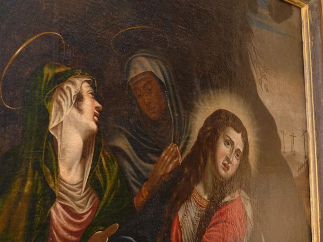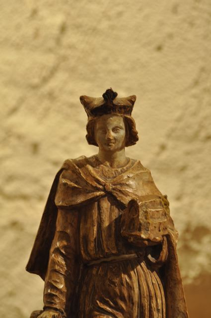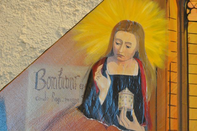 Then we went to the Basilica Marie-Madeleine in St-Maximin-la-Ste-Baume. The first and most important pilgrim site of Mary Magdalene. Look inside {PIC 06}. And outside {PIC 07}. It is incredible how many beautiful paintings, statues and panels of Mary Magdalene can be found in this basilica. And in what sorry state most of them are. Have a look at {PIC 08 – PIC 18}. Look also at the famous ‘noli me tangere’ scene {PIC 19} where the correct translation is not ‘do not touch me,’ but ‘do not cling to me.’ And the picture where Jesus is hanging on the cross and angels are collecting his blood {PIC 20}. A sure sign, for those who can see, that Jesus was still alive, for dead people do not bleed. In the town hall next to the basilica was an exposition about the building of the basilica. It was started in 1279 after Louis IX, king of France and Charles II king of Naples {PIC 21} and count of the Provence, had discovered the remains of Mary Magdalene in the chapel. With this lovely portrait of Mary Magdalene {PIC 22}.