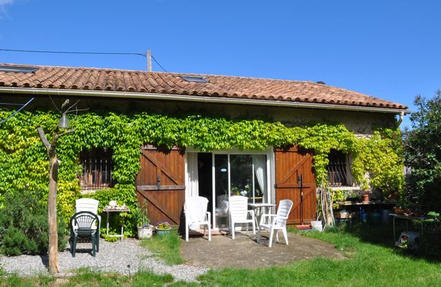 My place is covered again with ivy. And it is wonderful to sit outside, read a book and drink a glass with friends. Please do come, you are most welcome {PIC 34a}. Joke and Franklin are also sitting outside again. Most of the time with their computer {PIC 35}. Late in the evening the light of the setting sun covers our lady in a pinkish glow {PIC 36}. And the vultures from Bugarach keep drifting on the warm air {PIC 37}.