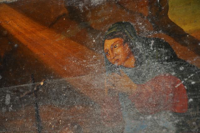 A little further, up the mountain is the village of Goulier. With this enigmatic portrait of Mary Magdalene, standing at the foot of the cross and looking up, through her fingers, at her beloved Jesus {PIC 51}. It was a beautiful day. The sun was still shining, but clouds were rolling in over the Pyrenees. A wonderful setting for the Stone of Sem {PIC 52}. One afternoon we went to Collioure. Mara had to see the sea, Mare Mediterranea {PIC 53}. In the church near the harbour entrance is chapel, first on the right, with a magic painting of Mary Magdalene, sitting in a cave {PIC 54}. Alet-les-Bains can’t be missed. Especially not the abbey. Some say the most beautiful ruin in France {PIC 55}. And what about the mysterious wall painting in the church. A man with an eastern face, a shield with a Chinese dragon, a scythe in one hand and the other on Mary Magdalene’s shoulder. What could be the meaning of that? {PIC 56}.