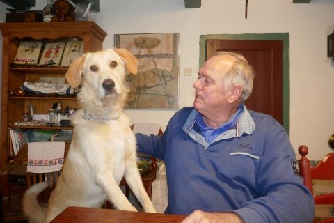 He is also reducing my freedom of movement. But maybe that was meant to be. On the other hand he is also keeping me fit, for I have to walk with him, every day, for at least two hours in the woods and meadows of Friesland. And when I am writing, he lies quietly in my room, obviously enjoying the typing sounds on my keyboard. He is good company.