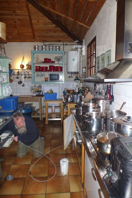 La Source, our lovely domaine, had her misfortunes as any-one else. Some ladies had forgotten that we have a septic tank. So the whole sanitary system was blocked. It took Axel and myself two full days to clear things and to finally to fish out some female ‘tissues.’ Tissues that should have been dropped in the little bins placed next to the toilet as had been explained to them. Then the tubes in the kitchen were clogged solid with fat. Which took us, it was mostly Axel, again another day to clear PIC 01}. Next the dishwashing machine broke down. A Miele. And friends, it really takes some effort to break down a Miele