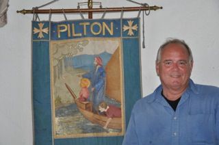 We made one other trip that day to one of my other favorite places, the church of Pilton. Pilton is famous for its incredible, huge rock festivals, but this church and especially this banner is my favorite. It shows Joseph of Arimathea taking Jesus II, the eldest son of Jesus and Mary Magdalene to the Tor, who in that time was surrounded by water and could be reached from the sea.