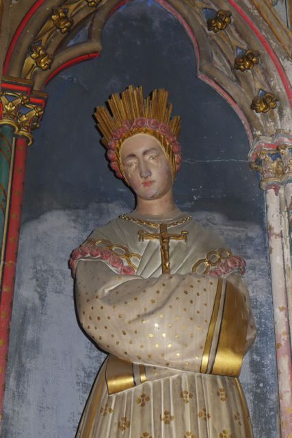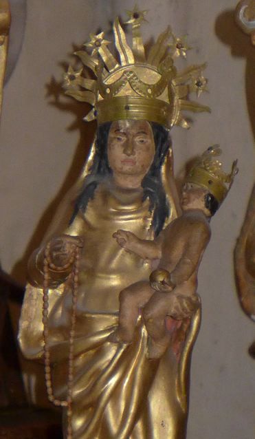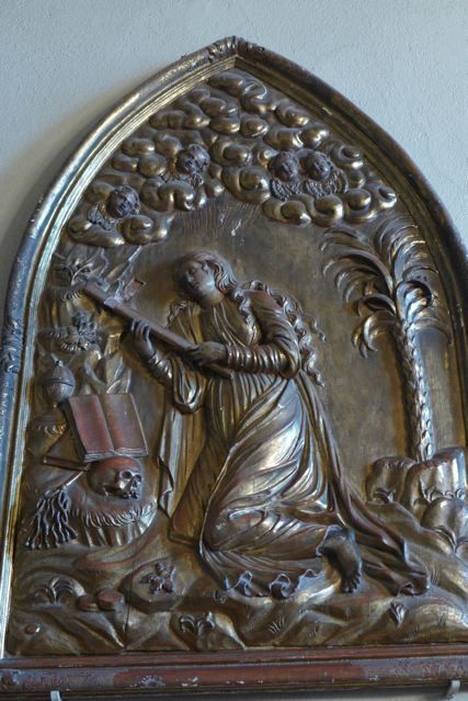 I enjoy hearing all your news, the letters are a good way to keep in touch so please keep them going! Your photos too, give a glimpse into a the wonderful world of Languedoc. There is much confusion about St. John, he is depicted with long hair and is supposed to be "the disciple that Jesus loved" in the gospel of St. John, but if you look closely, he has a man's square face and a man's large hands. Mary Magdalene is depicted with one or two of her symbols - hands clasped in a particular way, a jar that carried the oils to anoint Jesus's body in the tomb, a book representing (in the beginning the word was God - opening words of St. John's Gospel, plus often a skull, presenting our mortality. The masons use a skull and crossbones for these meditations in the same way. It does NOT mean that she took Jesus's skull out of his tomb and carried it with her. Meanwhile the statue of Ste. Madeleine. Madeleine is a popular girl's name not necessarily representing Mary Magdalene, as in the Madeleine source in Rennes-les-Bains. I think this was just a local saint called Madeleine.