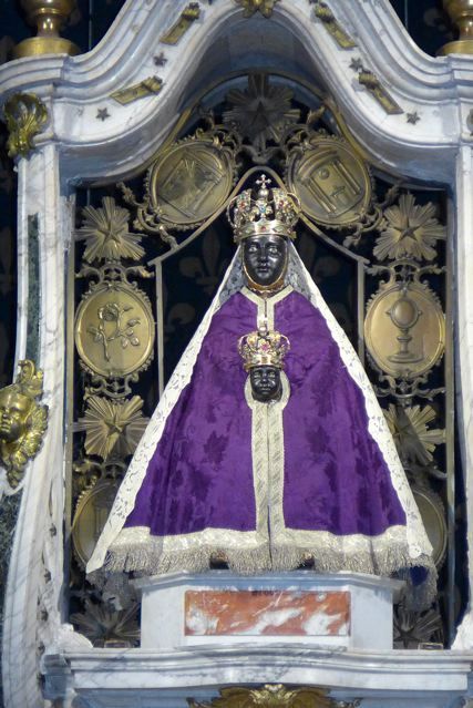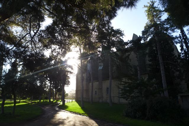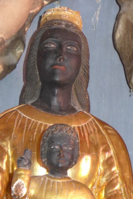 With my friend Val we visited Carcassonne. Looking at the Canal du Midi, the Eglise de Carmes with the statue of de ND de Salette. Later we went to the ND de Marceille in Limoux. It was a beautiful day. With bright sunlight, huge trees and long shadows. Look at the light touching my friend Val. Inside the basilica we looked at the new Black Madonna. And I gazed in surprise at the new nameplates under the statues stand next to Jesus on the cross. Where it now said St Jean, I always understood that Mary Magdalene was standing there. As she so often is, standing at the right side of the cross when looking at Jesus. Now there was St Jean. I don’t know. For me is it still Mary Magdalene, and a pregnant Mary Magdalene at that. On the other side of the cross now is a nameplate with Ste Madeleine on it. It doesn’t fit. On the left side is always the Virgin Mary, Mother Mary. Besides this woman is wearing a scarf, as Mother Mary does and looks much older, as Mother Mary does. See {PIC’s 12 – 23}.