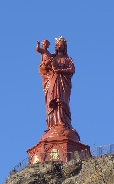 The area between Le-Puy-en-Velay and Clermont-Ferrand, the Ardeche and the Haute-Loire, has always been a very inviting area. The old heart of France. The sacred area of the Druids. The feminine centre of France. The area where the Black Madonna’s are plentiful. Magic. And the first magical experience is without doubt the fantastic ‘floating’ bridge of Millau. One of the new wonders of the world. Then away from the AutoRoute to Saugues. With its museum of the famous wolf of Gevaudan. And a large wooden statue, looking more like a crocodile than a wolf. There was snow and ice on the high land of France, all above 1.000 metres. We passed some incredible stone formations en route. Magic again. And finally arrived in Le-Puy-en-Velay, a five to six hour drive from Rennes-le-Chateau. Le-Puy-en-Velay is a beautiful town. Enclosed by high mountains that lie in a great circle around the place. One of the four starting points of the pilgrim route to Compostella. A place with churches high on the rock, with huge statues of the Virgin Mary, the Notre Dame de France, with a lovely old town and a beautiful cathedral. See {PIC’s 39 – 46}.