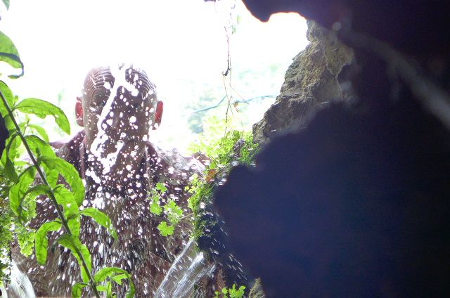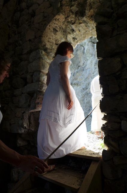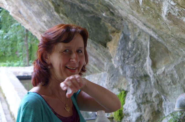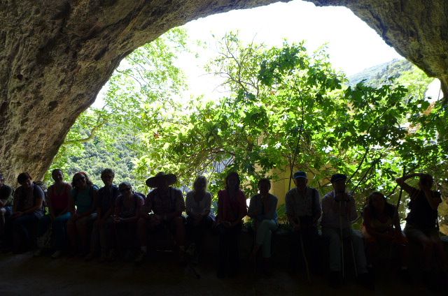 Friday June 6: Going east, to the Initiation caves of the Cathars in Ussat-les-Bains. A 70-minute drive. Having lunch at the church of ND de Celles. Looking at the famous White Madonna in the church that has been renovated in a beautiful way. Then going to the Cave of Bethlehem. Parking the car and walking up will be a 30-minute hike. If the cave is closed we can go to the Hermit Cave or to the Eglise Cave. But the path is open. On the little plateau just in front of the Cave of Bethlehem we all change in white clothes. It is a wonderful sight. Everyone dressed in white. So special. We are having an extended ceremony in the cave, conducted by Thomas and Tania. Very, very impressive. Driving back to Les Labadous will take about 75 minutes. See {PIC’s 67– 71}.