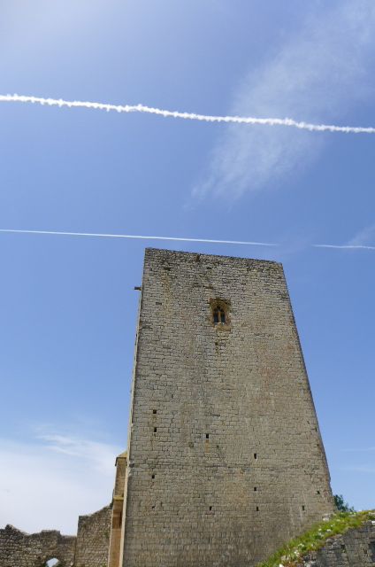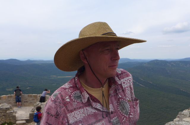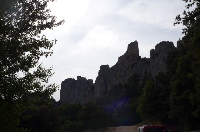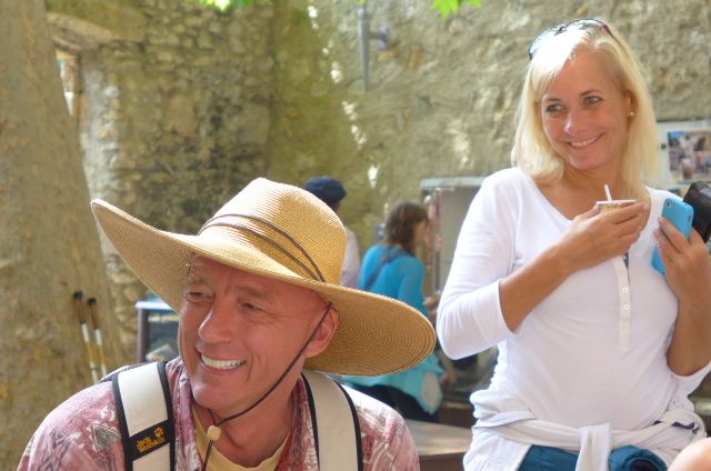 Tuesday June 3: Past the village and the mountain of Bugarach to the Col de Linas, the pass at the north side of the Pech Bugarach. Then via Cubieres to the Gorges de Galamus. A road hacked out in the rocks. With the monastery dedicated to St Antoine, the Cave of Mary Magdalene and the church built into the rock. With a cup of coffee on the terrace. Some of our friends were so moved that they started to sign in the church. A magic moment. A 40-minute drive. Then via St Paul de Fenouillet and Maury and past the castle of Queribus and the town of Cucugnan to the Cathar castle of Peyrepertuse. A 20-minute drive. We can walk up to the castle, a 30-minute hike. Then back to Les Labadous a 45 minutes drive. See {PIC’S 36– 48}.