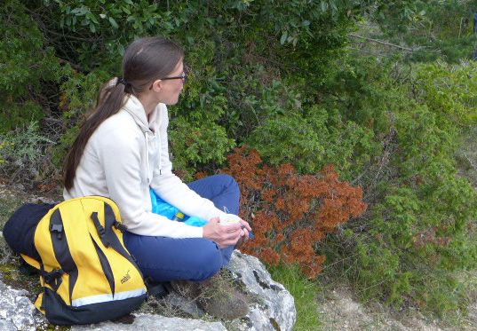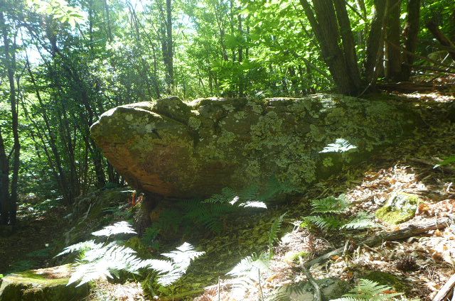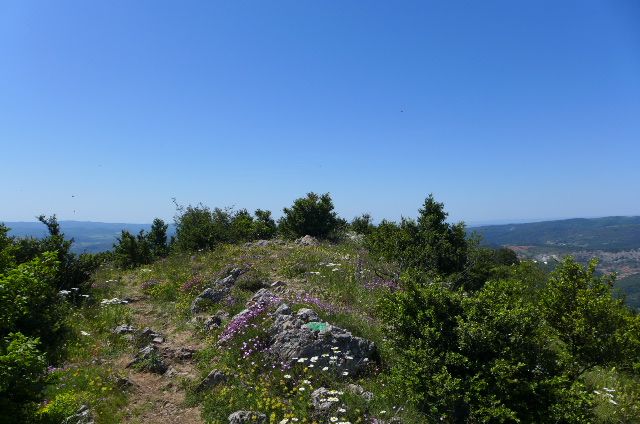 Thursday June 5: Driving past La Valdieu, the Pas de La Roque to Rennes-le-Bains. Then on a steep road up to Montferrand. A 30-minute drive. Parking the car and climbing the Pech Cardou, the sacred female Mountain. Having lunch at the magic spot where 5 roads come together. A perfect pick-nick place. After lunch climbing the final part to the top of the mountain. The view is magnificent. There is a stone circle at the top and the whole crest of the mountain is covered in flowers. It is magic. We stay for quite a while, enjoying the sun, the view and the flowers. Then descending the mountain and going back, just for a while, to the trembling rocks, entering the area from the other side. Such a special place. Then back to Les Labadous, a 15-minute drive. See {PIC’s 57– 67}.